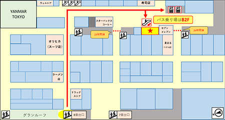 地上階段を降り「八重洲地下街」まっすぐ進み、突き当りを右に進むとバスターミナル入口があります。バス乗り場はB2Fです。
